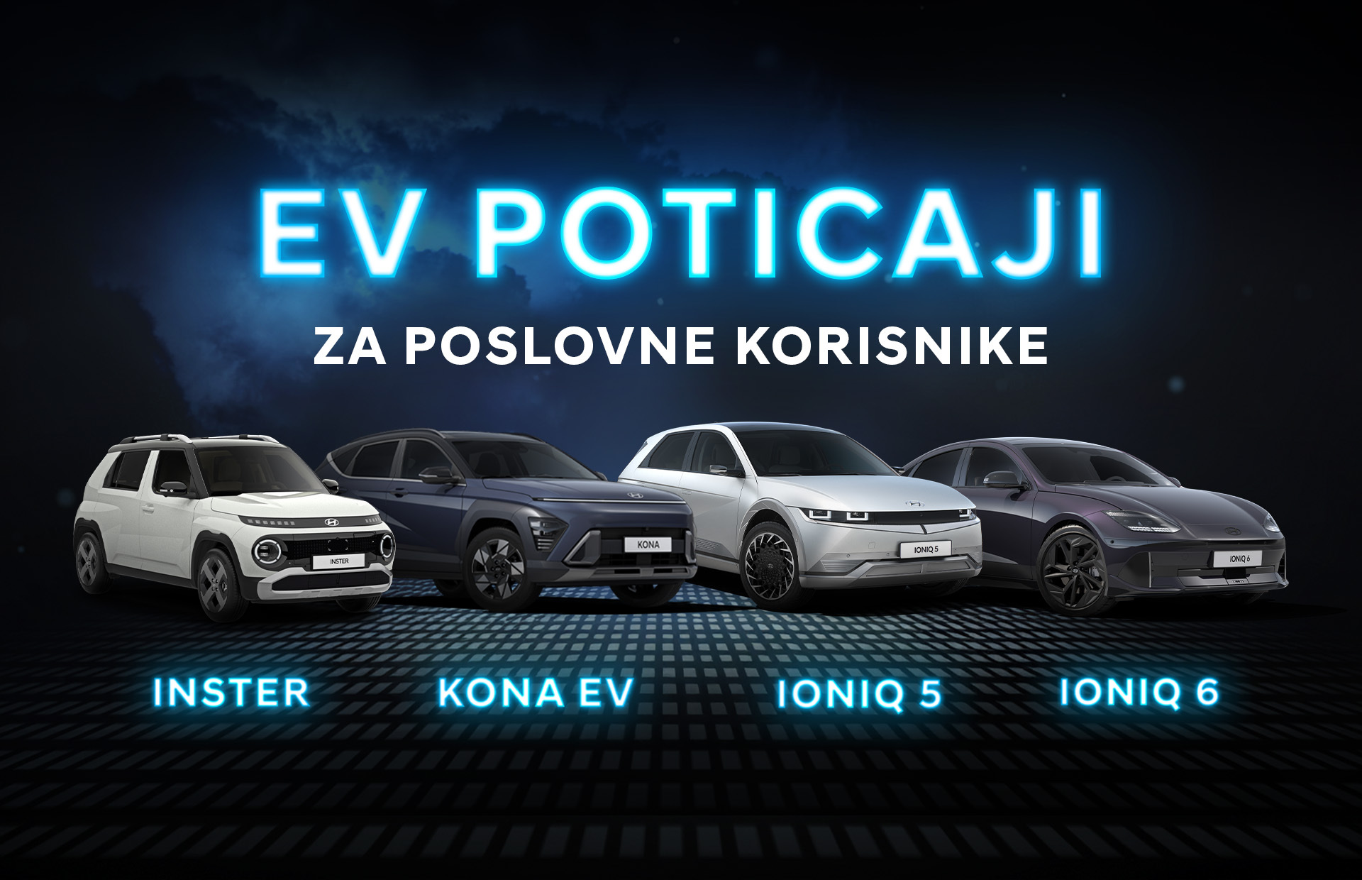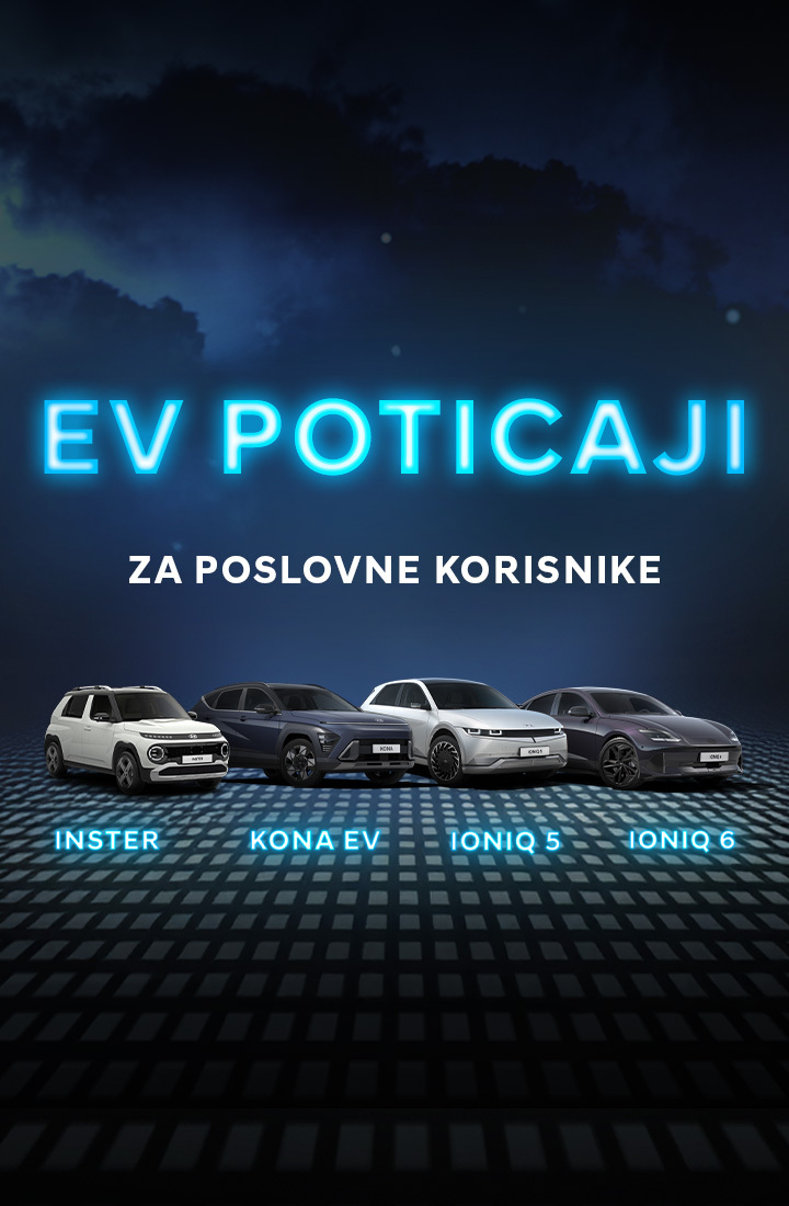 - IONIQ 5 – vrijedi za verziju IONIQ 5 RWD URBAN 63kWh (Potrošnja energije: 15,6 kWh/100 km, emisija CO2: 0 g/km, domet do 440 km prema WLTP standardu) – u cijenu je uključen državni poticaj za EV u iznosu od 9.000€ + eko bonus od 2.000€ i odnosi se isključivo na vozila sa zalihe.
