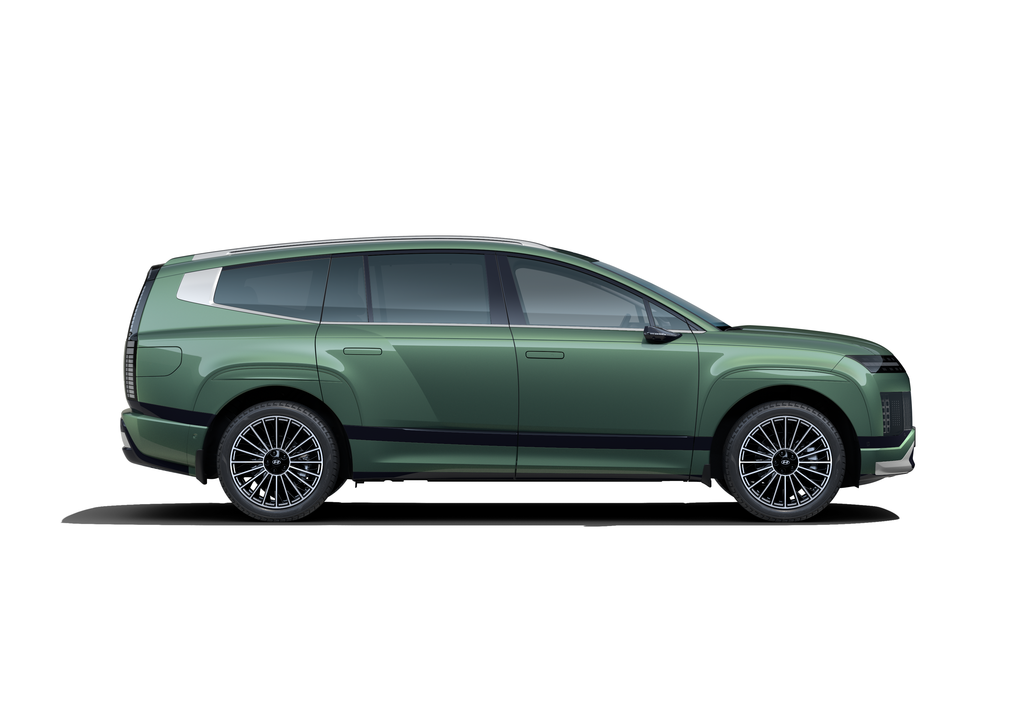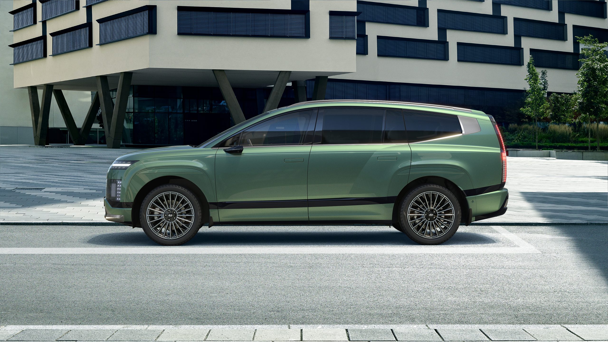 Horizontalne dnevne LED svjetlosne trake usklađene su s bočno postavljenim LED projekcijskim prednjim svjetlima, stvarajući prepoznatljiv svjetlosni potpis koji naglašava široki stav i čiste površine IONIQ-a 9.