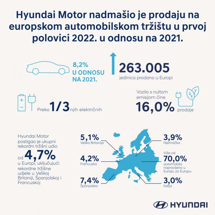Tvrtka je sveukupno prodala 263.005 jedinica u EU, EFTA-i i Ujedinjenom Kraljevstvu od siječnja do lipnja 2022., što je povećanje od 8,2 posto u usporedbi s istim vremenskim okvirom 2021. Ovi izvanredni rezultati naglašavaju snagu Hyundaijeve linije proizvoda u Europi, posebice u današnjoj izazovnoj tržišnoj situaciji.